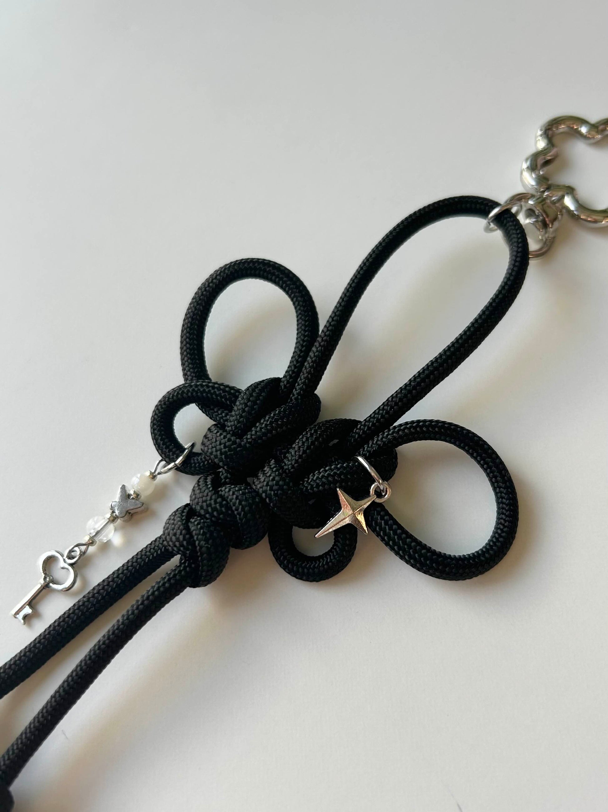 These handmade keychains feature butterfly knots. Made from strong paracord, each keychain includes silver accents ⊹₊。ꕤ˚₊⊹