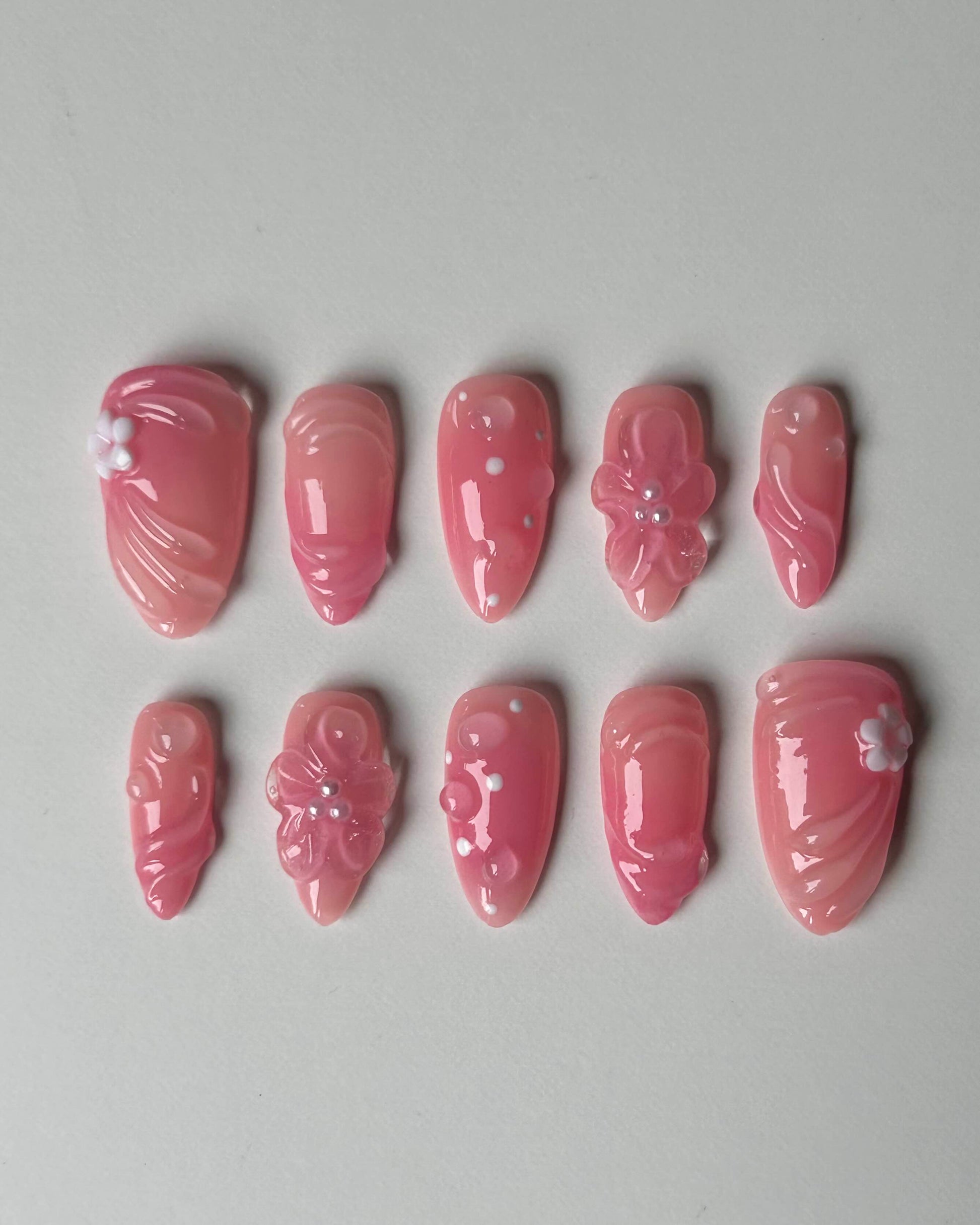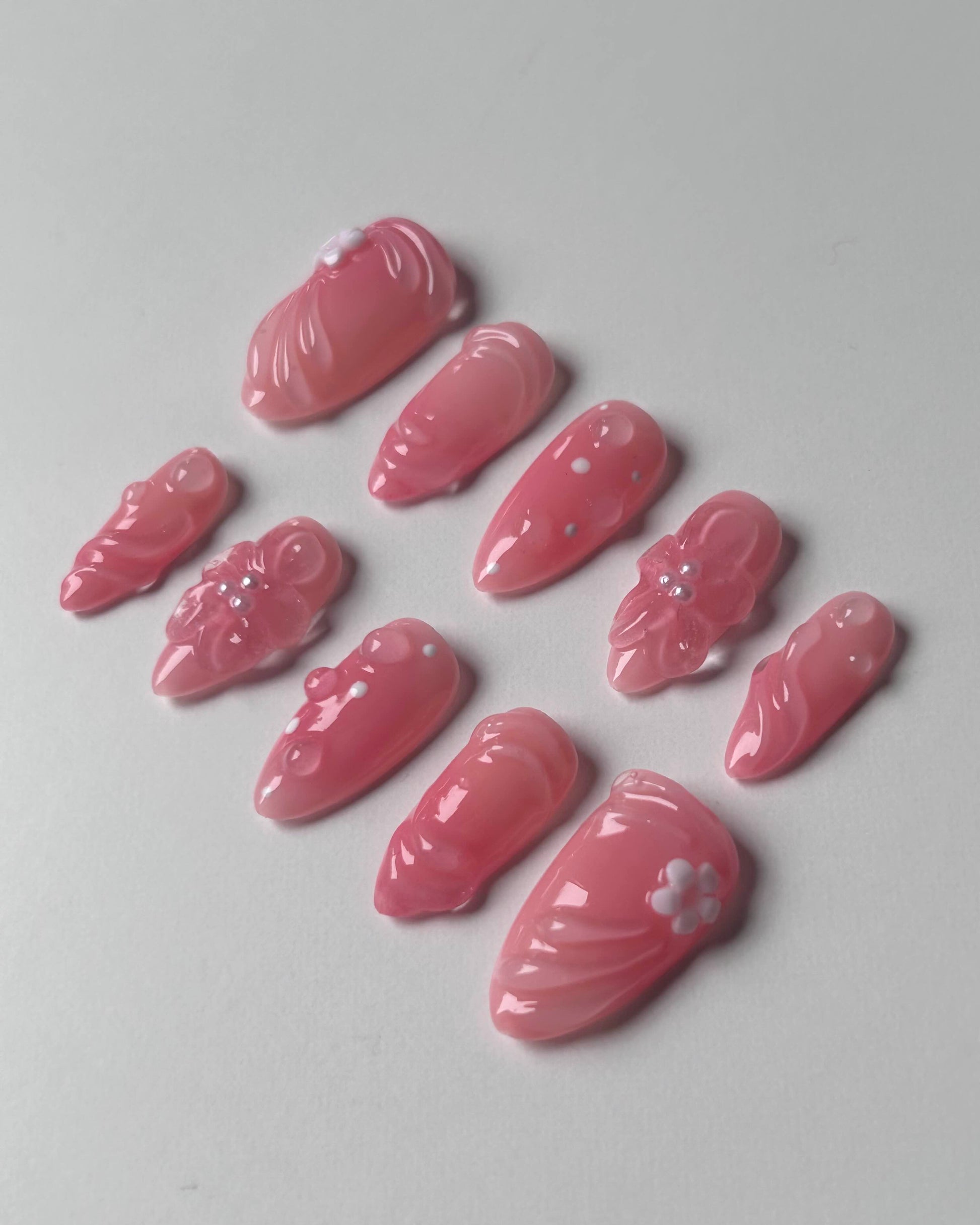 A dreamy blush pink milky set, with ethereal 3D florals and soft details ⊹ ࣪ ˖